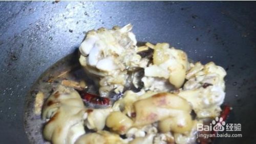 等冰糖炒融化后,放入猪蹄和干红辣椒一起翻炒