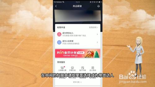 选择中间的商品橱窗功能,在中间的权限申请组里面选择成为带货达人,点击进入后选择带货权限申请即可开通抖音的商品橱窗。