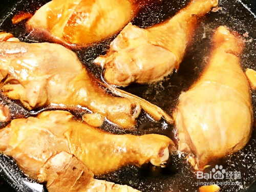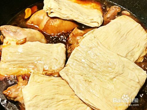 卤20分钟时给鸡腿翻身顺,便平整放好生豆皮一起盖锅卤10分钟。