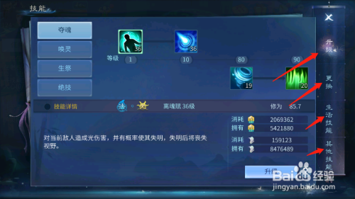 3、点击技能,可升级异人技能;点击进入:可进行技能升级,更换,学习生活技能,及其他技能;