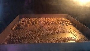 完全融化,转最小火,看这漂亮的焦糖色~这个时候,粗暴的把那两碗渣渣倒进去,搅合至每一粒渣渣都粘上糖~然后倒入不粘的烤盘上,烤盘可以垫烘焙纸~用刮板压紧整形~压压压压压~用吃奶的力气,压的规整漂亮尽量~如果你觉得你压的不够紧不够漂亮就硬了,没关系,烤箱120度保温几分钟,软一点了,再压一次