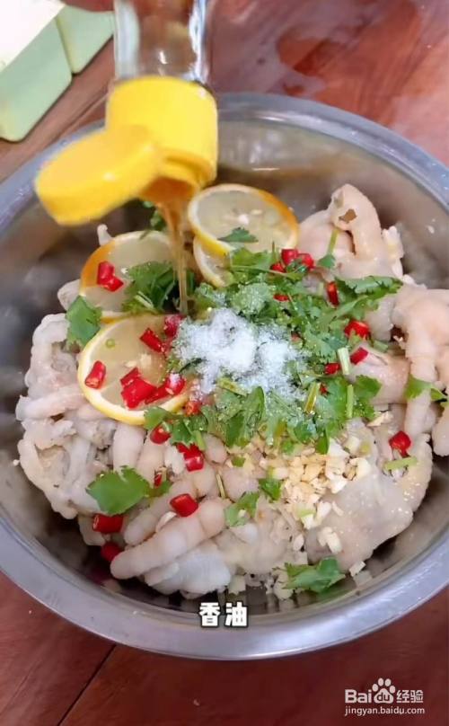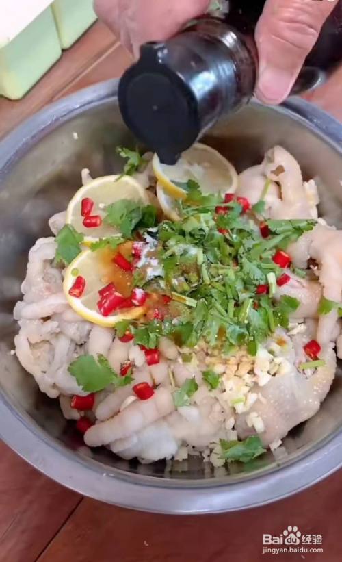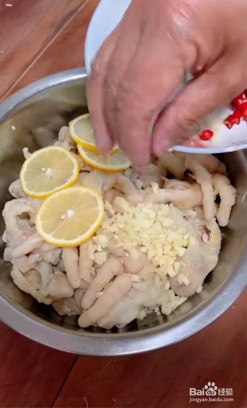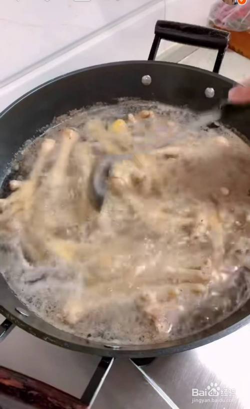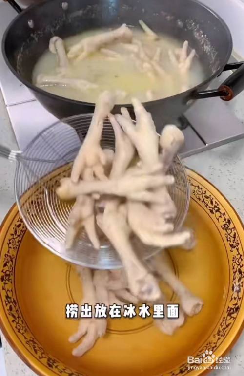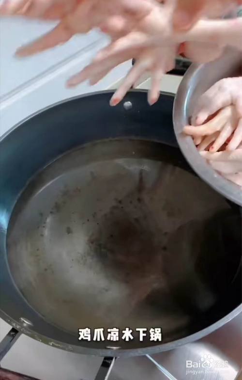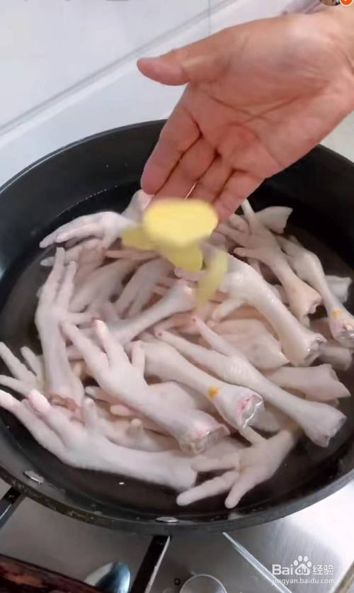 鸡爪洗净,剪掉指甲,下过,放进姜片料酒焯水,十五分钟。