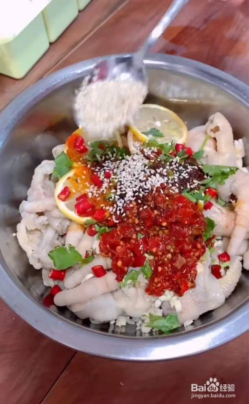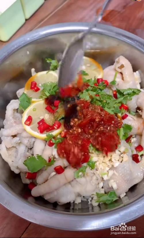 放入柠檬,香菜,白糖,小米辣,生抽,醋, 白芝麻,盐,耗油,剁椒酱,蒜末,香油,辣椒油,