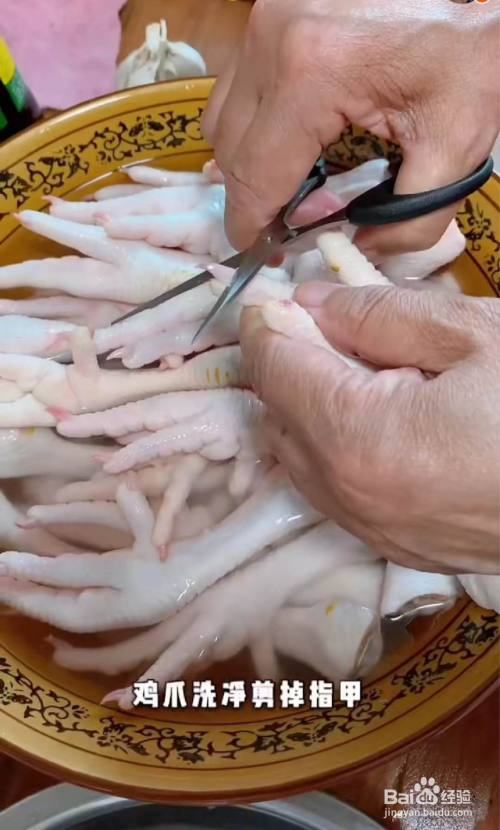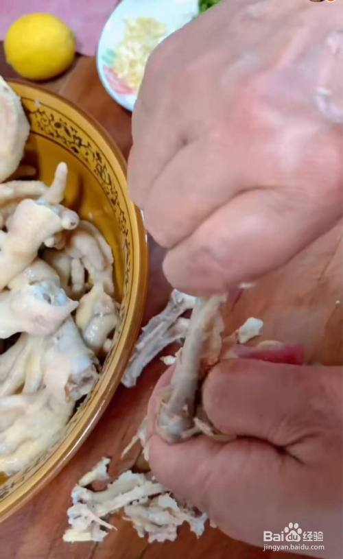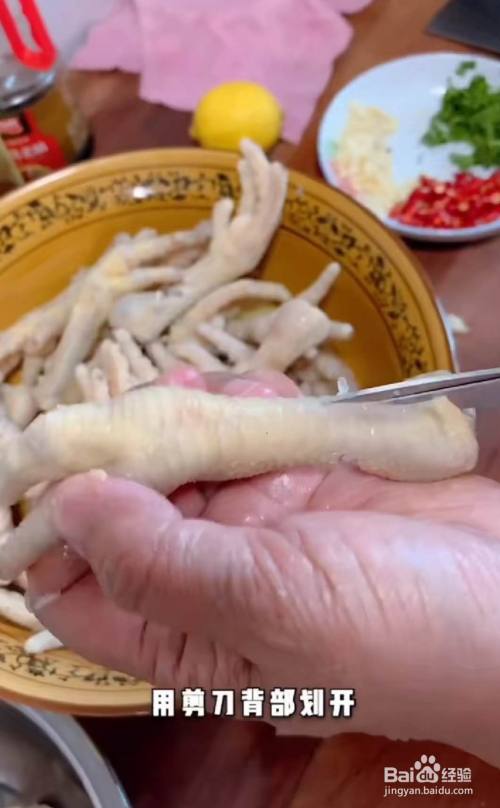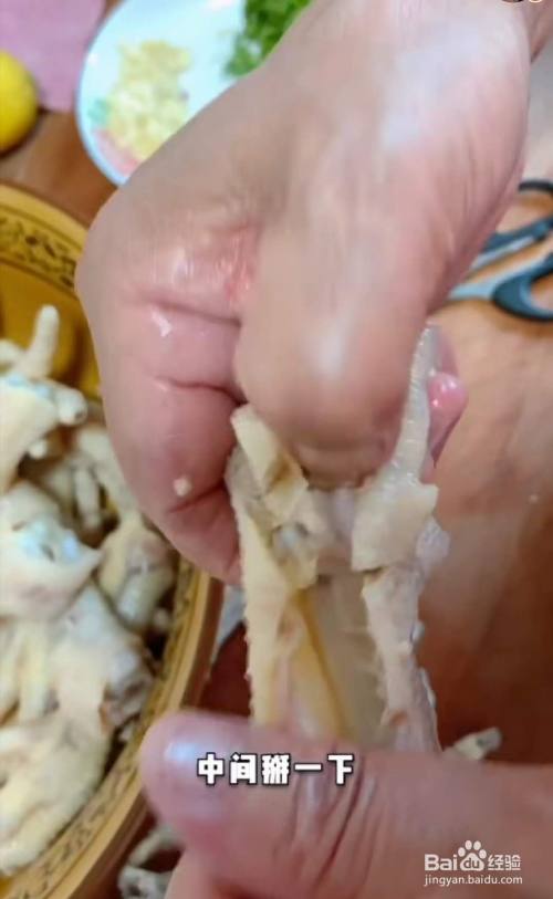 用剪刀顺着鸡爪的根部剪开,中间摆一下取出骨头。