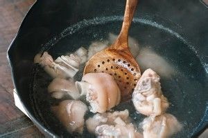 猪蹄焯水后放入温水中软化,刮去猪毛。