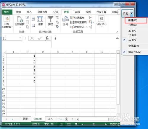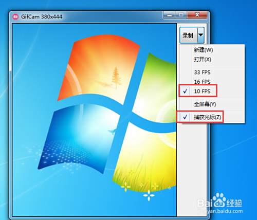 录制之前,可以先进行简单的设置.点击【录制】按钮右侧的倒三角,在下拉菜单中可以守则录制的帧数,帧数越高,文件就越大,一般保留默认的10FPS就可以。另外勾选捕捉光标,这样就可以看到录制后的鼠标移动过程。