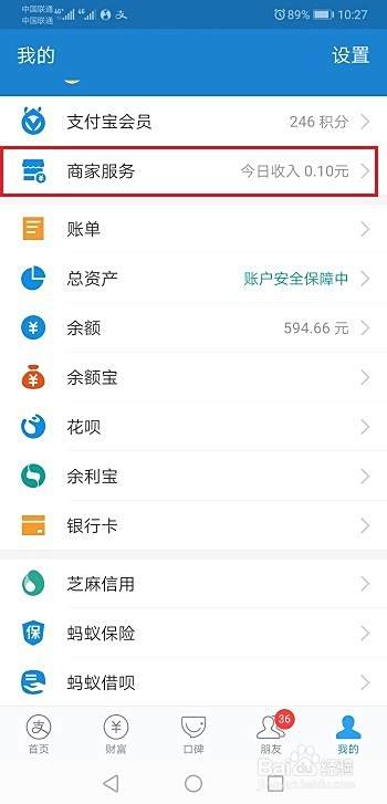 第一步打开支付宝,进去我的界面之后,点击商家服务,如下图所示: