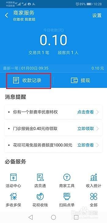 第二步进去商家服务界面之后,点击收款记录,如下图所示: