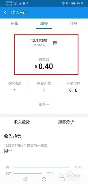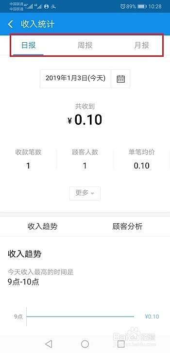 第四步我们也可以看一下收入统计,可以看到每一天的总收入,收款笔数,顾客人数,单笔均价等,如下图所示: