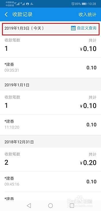 第三步进去收款记录之后,可以看到当天的收款记录,也可以自定义进行查询,如下图所示: