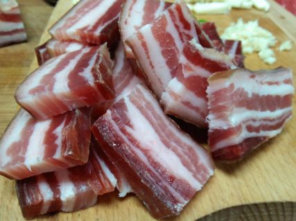 3金字家常咸肉切成片。
