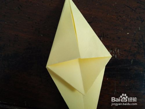 然后翻到背面,我们把刚折的两侧的边向内折。另一侧的同样操作,全部折好后就是图三的样子。我们把尖角向内折,然后再恢复原位。