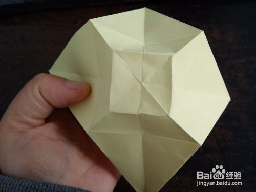 两侧全部折好后就是图一的样子,翻到背面,我们把两侧的角折到中间正方形的内部,如图四。