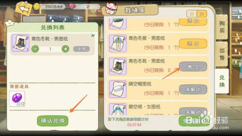 在打开的裁缝店中,点击右侧兑换,选择其中的青色冬靴-男图纸,进行兑换即可获取青色冬靴-男图纸。