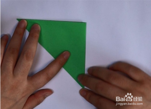 再取一张绿色方形纸,对角线对折成三角形。