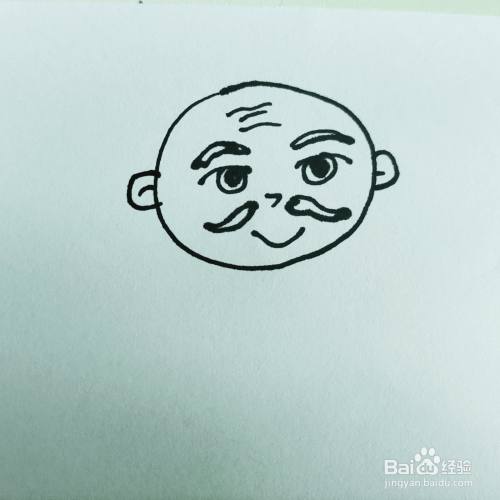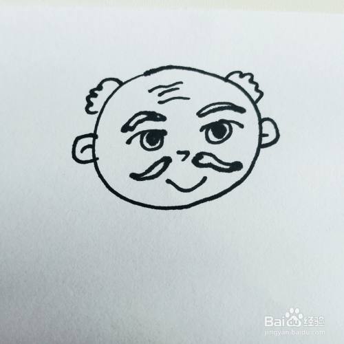 第三步,我们来画卡通老爷爷的两边的耳朵,以及嘴巴,和两边的胡须。