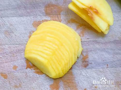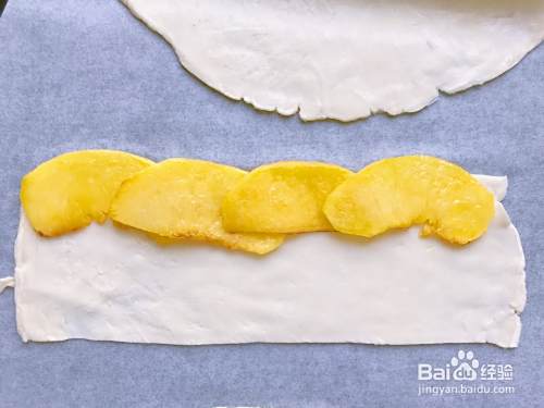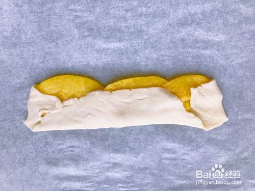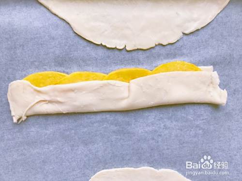 旁边两片面皮放入黄桃后,把两边多出来的面皮折上去,卷起来
