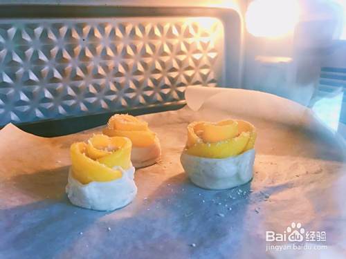 蒸烤箱预热,200度烤25分钟即可,在大概18分钟的时候上层盖上锡纸,防止黄桃烤糊!