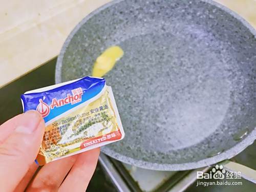 锅里加黄油5g,安佳黄油一小盒是10g,掰一半就好,非常方便