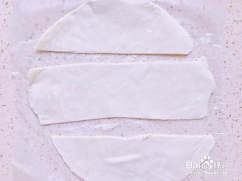 手抓饼取出来就撕掉塑料膜放在垫了油纸的烤盘上。因为手抓饼软了以后会粘在塑料膜上!手抓饼软化后切成均匀的三条!