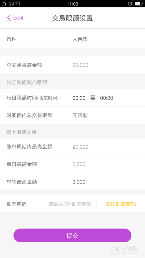 点击确认,进入到交易限额设置的提交界面,输入动态密码点击提交就可以了,如图