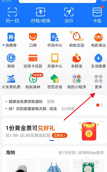 找到并打开手机“支付宝”app,进入支付宝首页,点击“更多"选项。