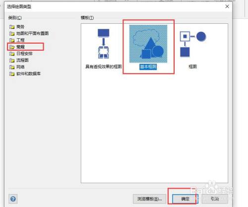 新建一个Visio2016文档,打开后,在弹出的选择绘图类型中点击“常规”,点击“基本框图”,点击确定按钮。