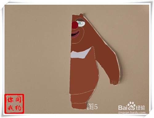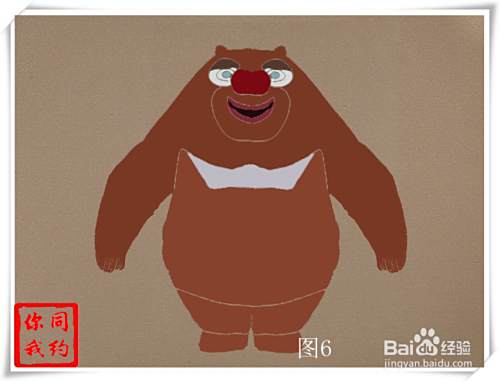 剪掉后如图4,然后用画笔给“熊二”涂上颜色(注意熊二的皮肤是棕色的,鼻子有点红色,胸前有白色的一块)(如图5)