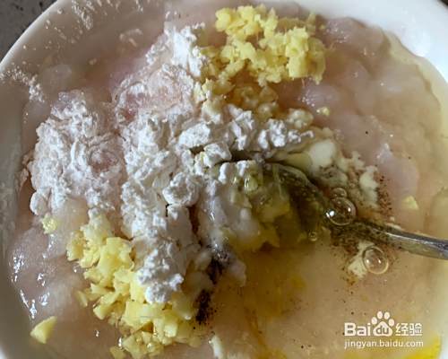 加入1/3玉米淀粉、姜粉、胡椒粉、蛋清、油和糖。开始朝一个方向搅拌。