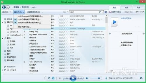 返回Windows Media Player播放器后,切换到媒体库界面,选择媒体流功能,勾选两项“允许远程控制我的播放器”、“自动允许设备播放我的媒体”
