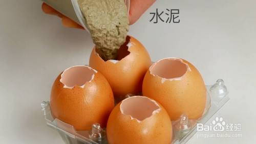 在剩下的鸡蛋壳中,倒入水泥。