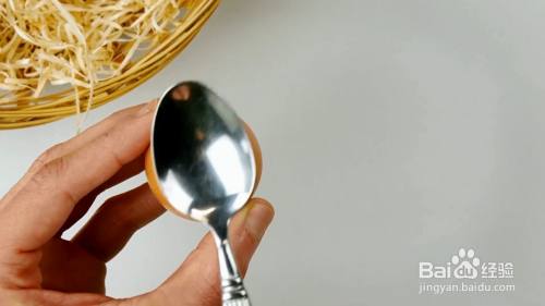 用勺子敲击鸡蛋的顶部。