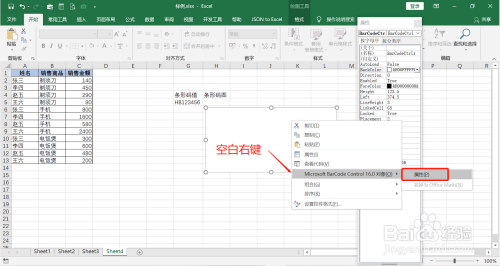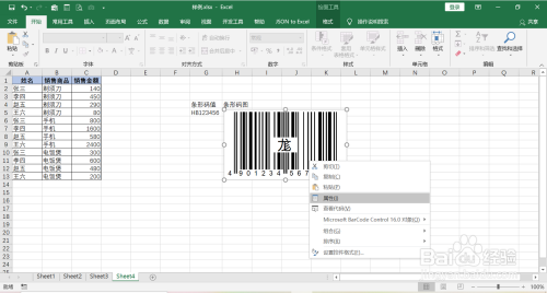 在”条形码“图案上单击鼠标右键,在弹出的快捷菜单中选择“属性”,如下图所示。