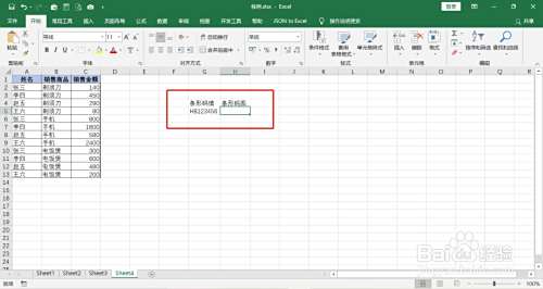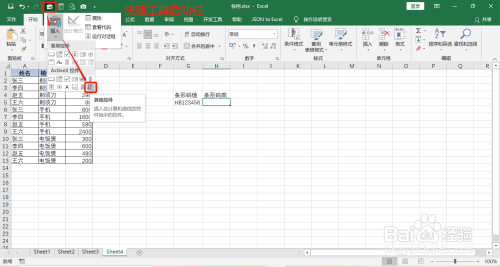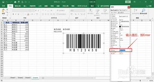 分别在单元格G4输入“条形码值”,H4输入“条形码图”,G5输入“HB123456”,如下图所示。