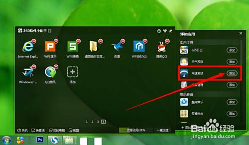如果通过滚动“添加应用”右边的黑色滚动条,可以找到自己想要的应用,就可以直接点击右边的添加按钮,直接把这个应用的快捷方式添加到360软件小助手里面,比如网速测试