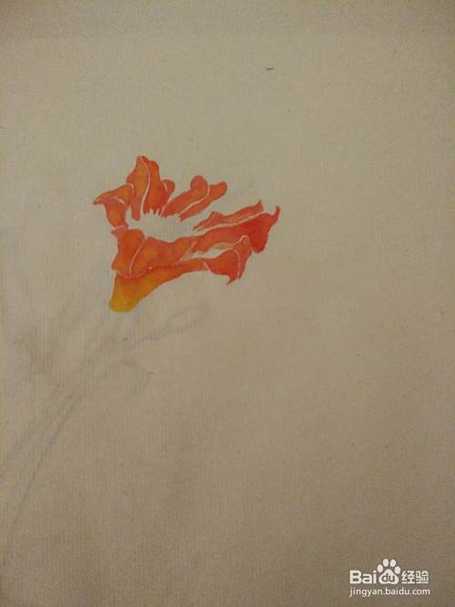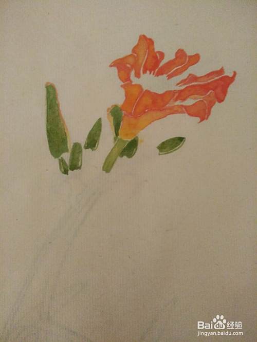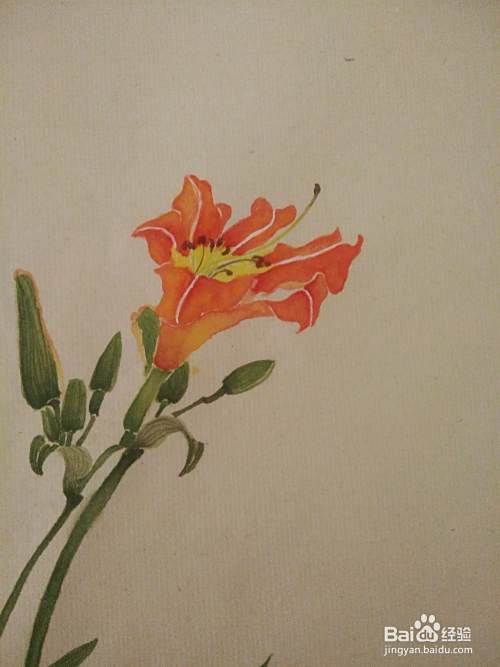 用朱膘+藤黄+大红调成偏红的橙色,平涂萱草的各花瓣。可以在花瓣处撞入一些藤黄水。