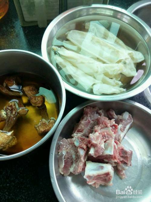 干的松茸要提前一小时泡(干松茸先洗一次水,水倒掉。然后加适量的水泡,这时候的水不要倒掉可以加入煲汤)。洗净排骨。