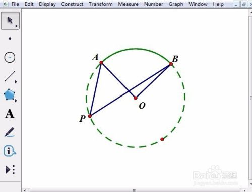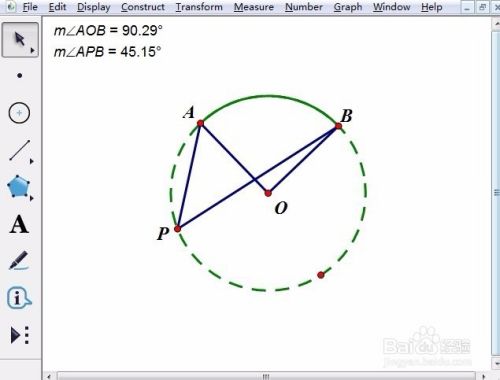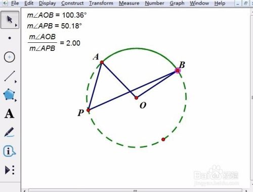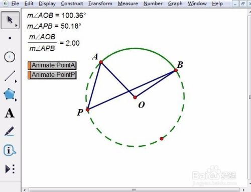 步骤二 度量圆心角和圆周角的度数。按顺序选中A、O、B三点,执行“度量”——“角度”命令,在画板左上角马上就显示出∠AOB的大小,同样的方法可以度量出∠APB的大小。做到这里,就可以进行手动演示了。
