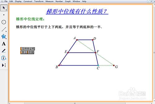 以上课件中,验证的是梯形的中位线定理,点击“怎样来证明”操作按钮,就可以自动作出辅助线,分别作出线段BC和AF的延长线,使其交于一点G,这样就可以把上底AD转换到下底边,变为线段CG。然后就变为△ABG的中位线,然后就是等于底边BG的一半,从而就得出梯形的中位线等于两底和的一半。