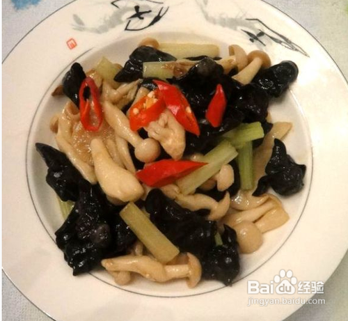 倒入木耳,倒入酱油。进行翻炒。加入芹菜调一下味道。