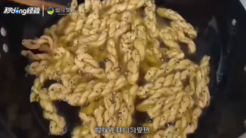 8锅中倒油,油热后放入麻花胚,搅拌让麻花均匀受热。