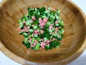 2.黄瓜和火腿切条,再切成丁,我用了一根玉米肠,一根王中王火腿肠