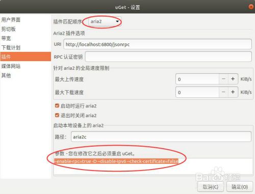 选择插件匹配顺序“aria2”,参数设置:--enable-rpc=true -D --disable-ipv6 --check-certificate=false