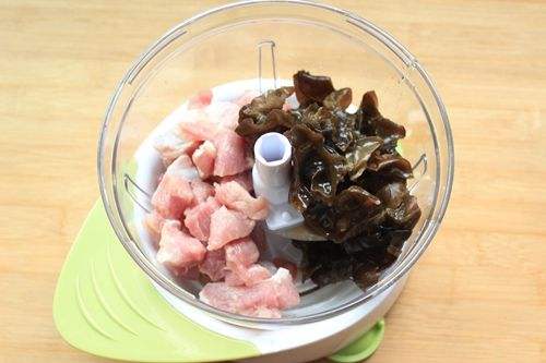 3切好的芹菜和搅好的黑木耳肉放入锅中,然后放盐和生抽搅拌均匀