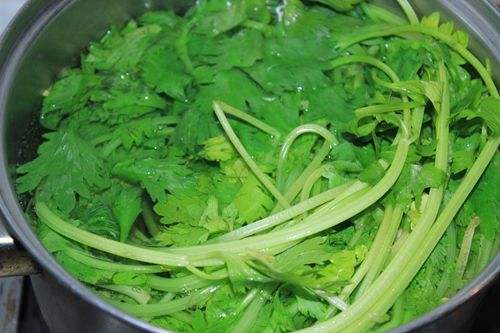 2芹菜洗净,锅中放水煮开放入芹菜烫一下,然后再切碎