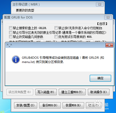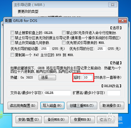 打开bootice 主引导记录--选择grub4dos--延时填入10--写入磁盘--确定