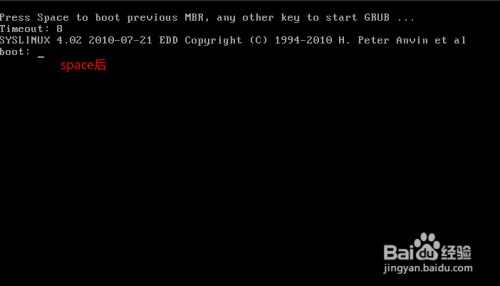 重新启动时MBR里的grub会延时引导这时按设置space键就可以进入syslinux,等待10秒或者其它按键会进入grub