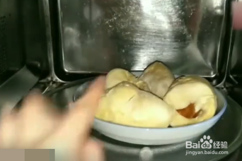 1、先把没有熟的榴莲拨开,缠上保鲜膜包好。然后把缠好的榴莲肉放进盘子里面,放进微波炉里面。接下来就是把微波炉打开,大约转5分钟左右即可烤熟。