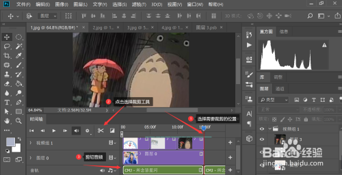 将帧移动滑鼠移动到需要剪切的音频处—>选择时间轴文本框中的剪刀工具—>点击音轨上的音频,即可将多余的音频减去