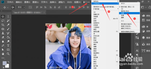 打开ps软件,在菜单栏中点击窗口—>在弹出的选项卡中选择工作区—>在右侧的选项卡中选择动感